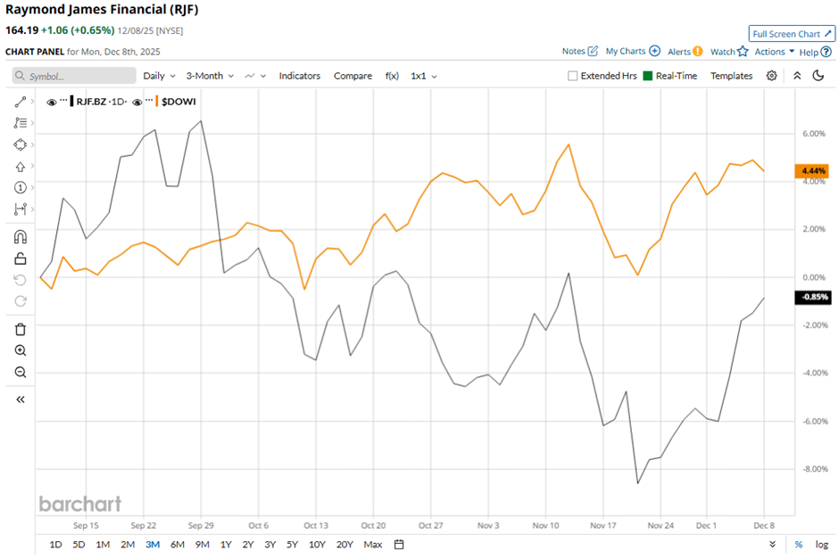 RJF stock has fallen 7.6% from its 52-week high of $177.66. Shares of the firm have declined marginally over the past three months, lagging behind the broader Dow Jones Industrials Average's ($DOWI) 4.9% return over the same time frame.