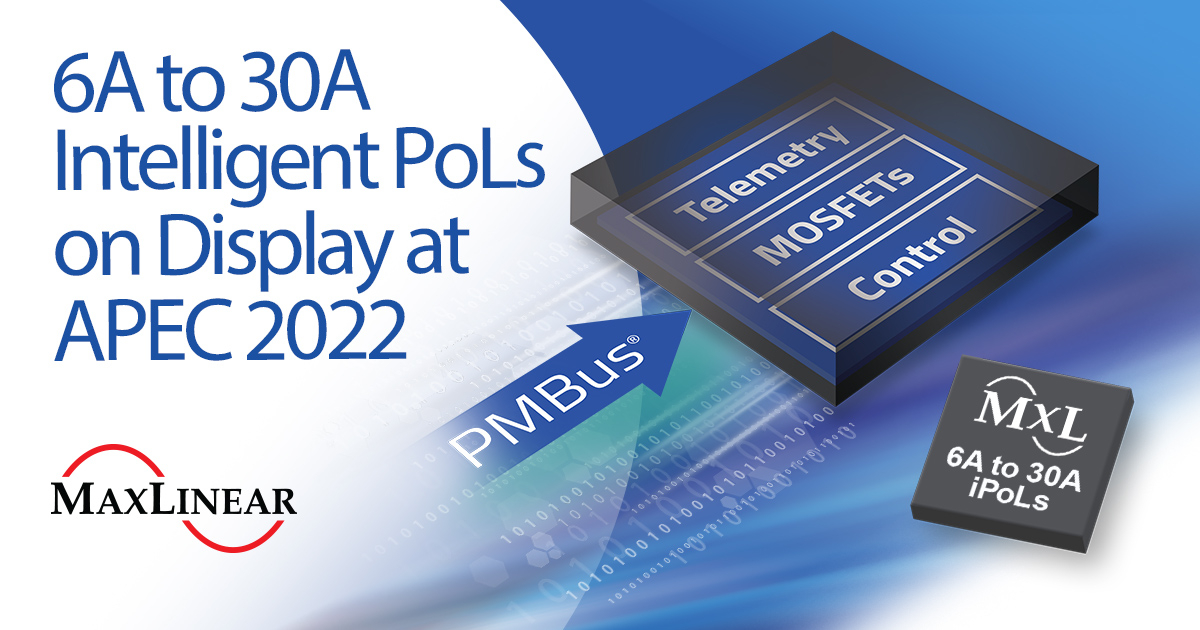 MaxLinear Inc. (NASDAQ: MXL) announced a new line of Intelligent POLs (iPOLs) supporting server, data center, networking, and wireless communications applications. The MxL76xxP series are step-down, synchronous regulators available in four versions based on current rating (6A, 12A, 20A, 30A). Combined with a PMBus® digital interface, the devices allow for precision control and monitoring.